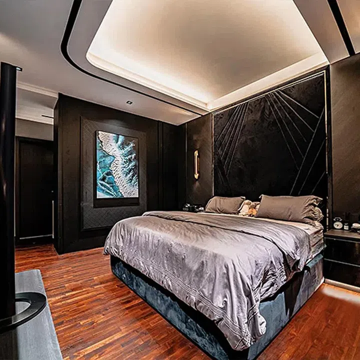The owner is an entrepreneur with a family of four, including an infant daughter and a primary school-aged son. Along with a luxurious home that could accommodate everyone comfortably, he also requested a darker colour scheme.