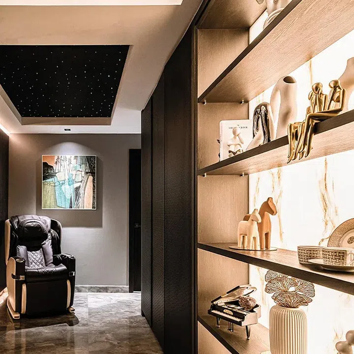 A cosy corner has been set up on the left with a high-tech massage chair and another recessed ceiling, this time covered with black plaster with pinpricks of LED lights. Relaxing or reading under a starry night sky is the desired effect.