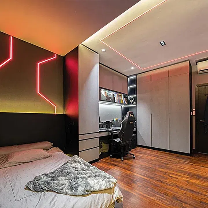 With its gaming-inspired design, the second bedroom is clearly for the son. Bold straight lines have been carved into part of the ceiling and bedhead, which can be lit in any colour with special effects like pulses and flashes.