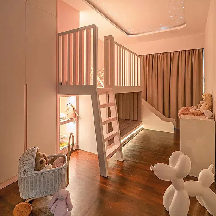 Two bedrooms belong to the children. The first is a white and pink confection, featuring a bunk bed with a slide.