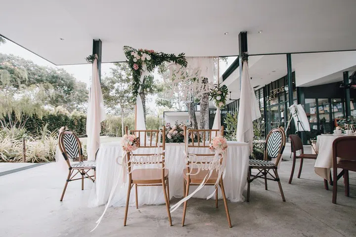 Wedding decor includes a lush floral arch, and a cosy reception can also be held within the luxurious comfort of the premium suite.