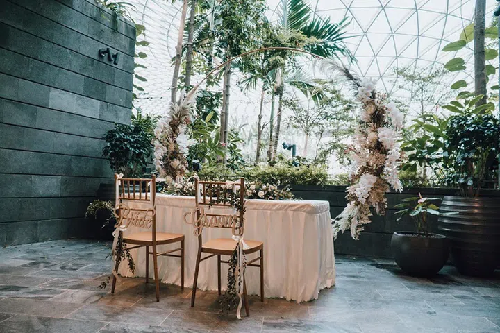 Here, you can pledge your love underneath a three-metre-high flower arch located near the Topiary Walk. Meanwhile, guests can enjoy light bites at the plush Jewel suite (Level 4), which can also double as a space for a tea ceremony before the solemnisation ceremony.
