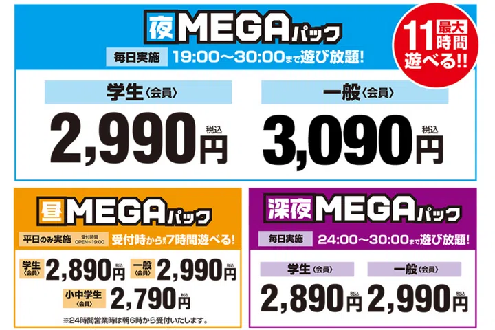 The blue box Night MEGA Pack (7pm to closing time at 6am) costs 2,990 yen (S$24.33) per student member or 3,090 yen (S$25.14) per adult for up to 11 hours of unlimited play. The orange box Day MEGA Pack (weekdays from opening to 7pm) is 2,890 yen (S$23.52) per student or 2,990 yen (S$24.33) per adult for up to seven hours, while the purple box Late-Night MEGA Pack (midnight to closing) runs 2,890 yen (S$23.52) per student or 2,990 yen (S$24.33) per adult. For ~390 yen (S$3.17) extra, upgrade any pack for unlimited drinks; add ~400 yen (S$3.46) for Spotcha access here, plus 200 yen (S$1.73) for non-members.