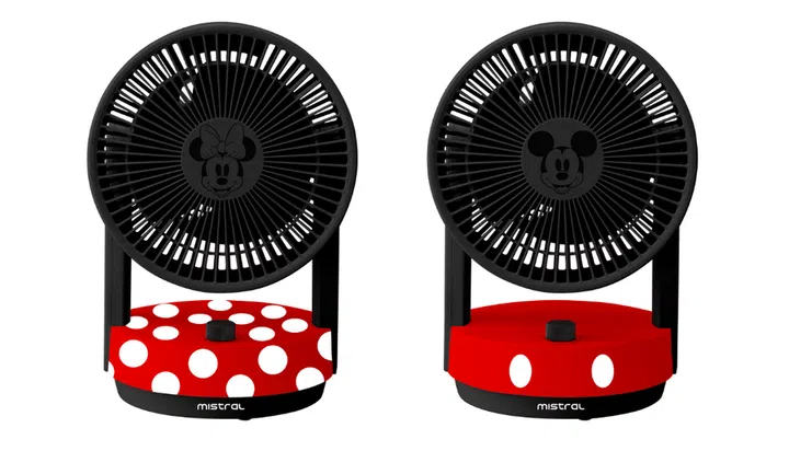 Give your office or work-from-home set-up extra pizzazz with these fans stamped with the polka dots and buttons of Mickey and Minnie's outfits - you'll also find their faces in place of the Mistral logo in the centre.