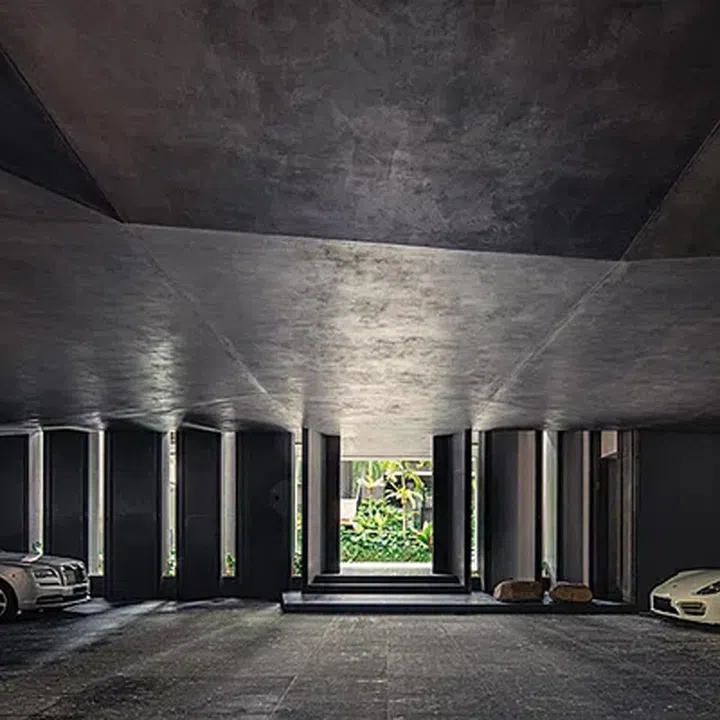 The main entrance is through the garage, which comfortably fits eight cars. It is dimly lit to create the feeling of walking through a cave. As soon as the doors open, the eye is immediately drawn to a lushly landscaped indoor courtyard that is not readily apparent from the street.
