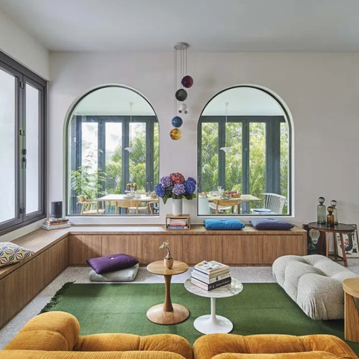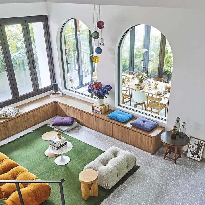 Under the arched openings facing the dining room at the side of the building and the tall windows towards the front is a built-in L-shaped bench with a bay window.