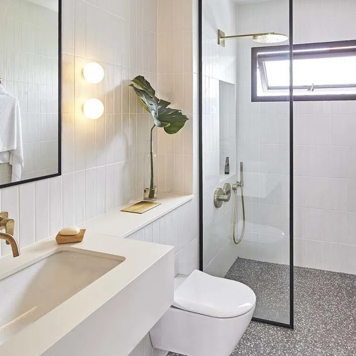 The attached bathroom follows the same design aesthetic with its grey terrazzo flooring and matte white subway wall tiles. An interior finished in neutral colours creates a calm atmosphere.