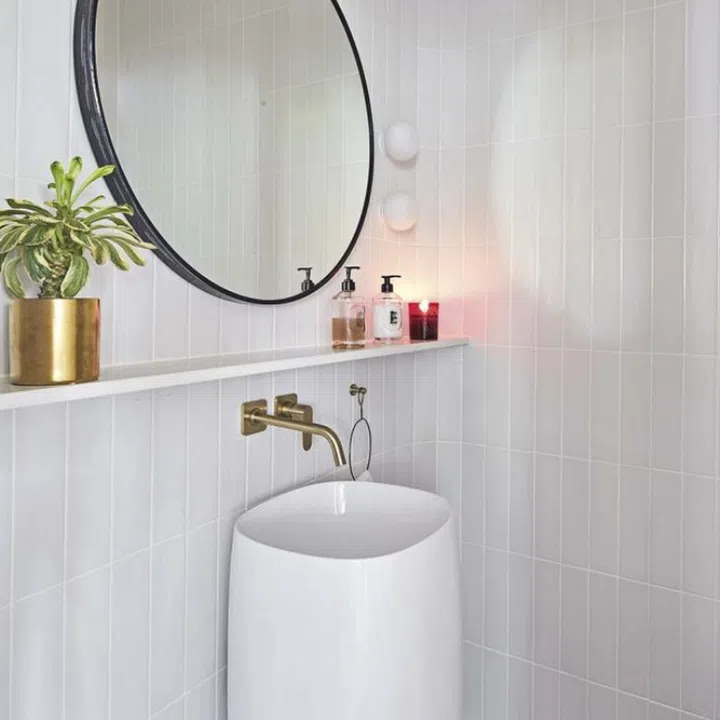 The powder room on the first storey continues the black and white theme from the adjacent dry kitchen.