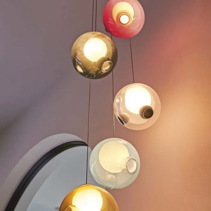 Bocci Series 28 pendant lights in mixed colours hang between two arched openings.