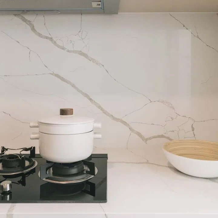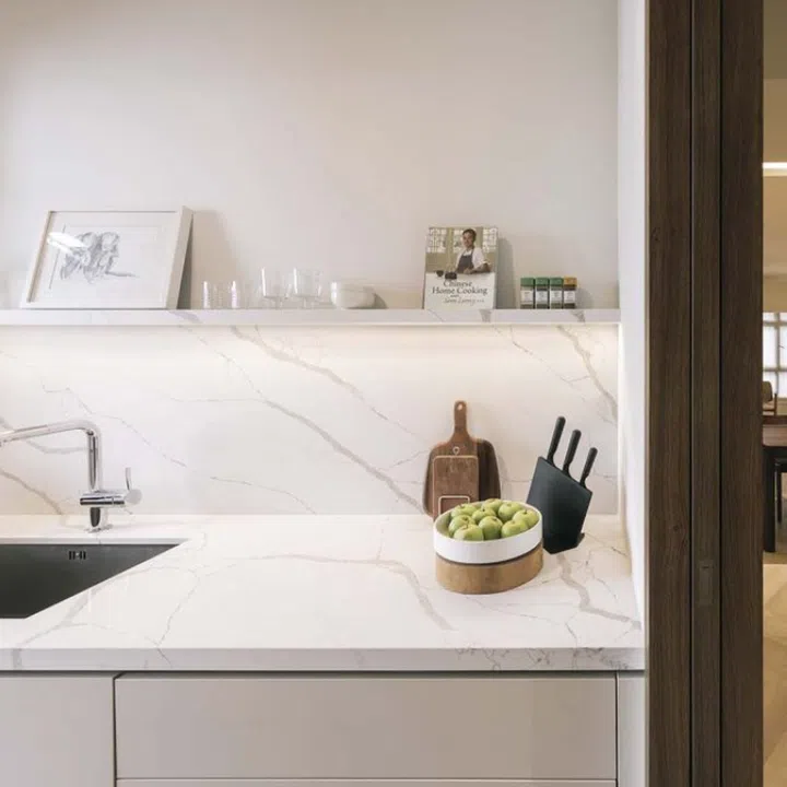 The kitchen’s quartz surface features gold veins that resemble Japanese pottery’s kintsugi technique.
