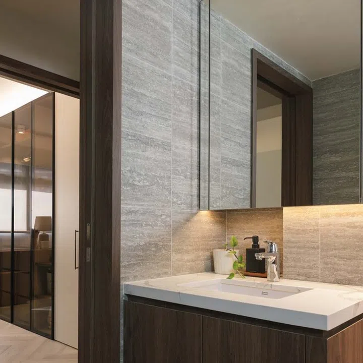 Complementing the off-whites and wood tones are natural materials that include rustic solid teak stumps used as a lamp stand in-between two chairs in the living room and as a vanity stool in the walk-in wardrobe, a pair of polished granite coffee tables custom-designed by Candise’s brother, and travertine-like bathroom wall and floor tiles.