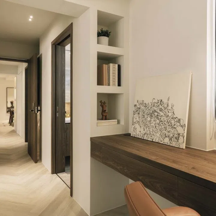 The shift also created an alcove in the master bedroom for a cosy study corner, as well as a small recess beside the bedroom door.