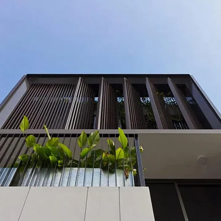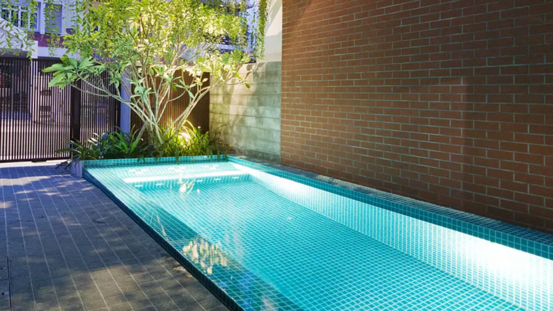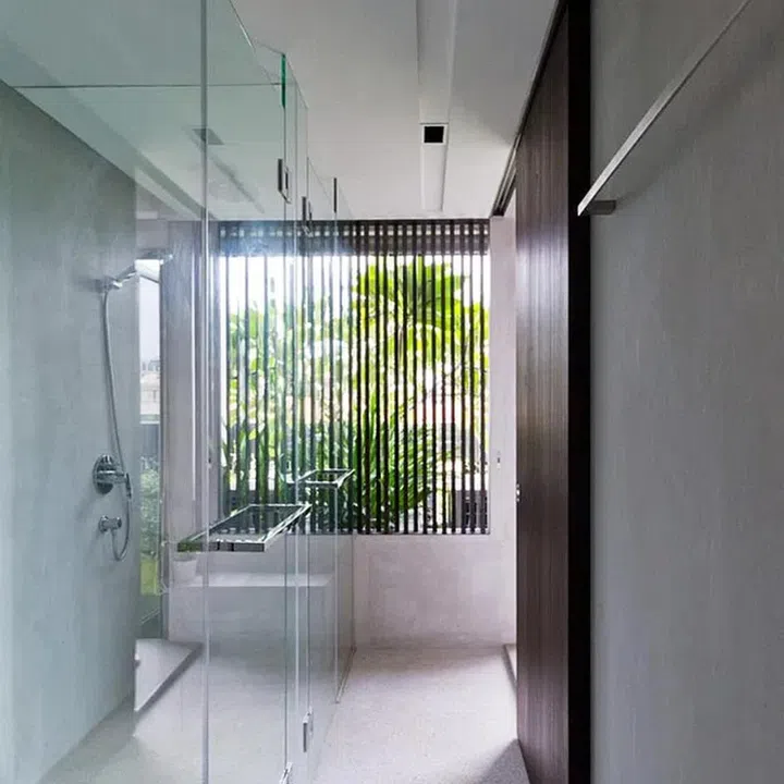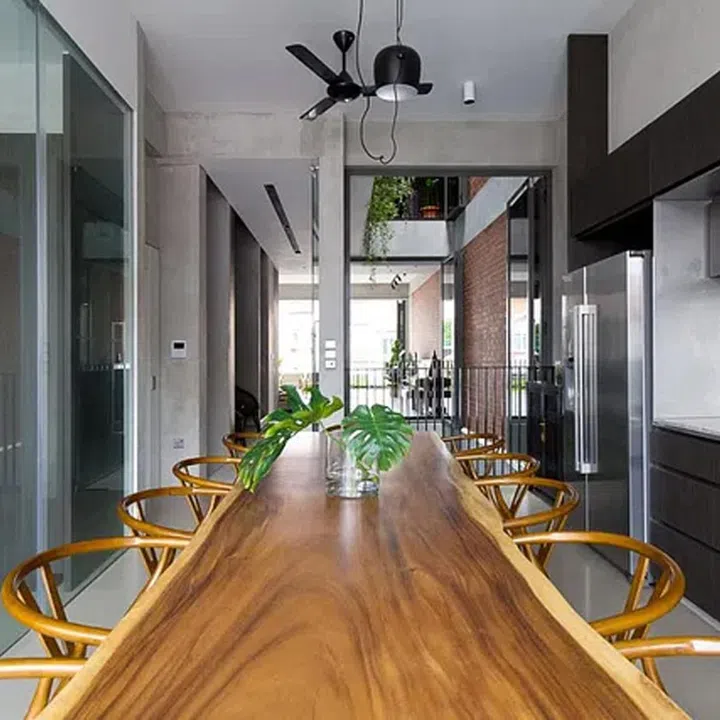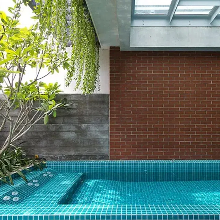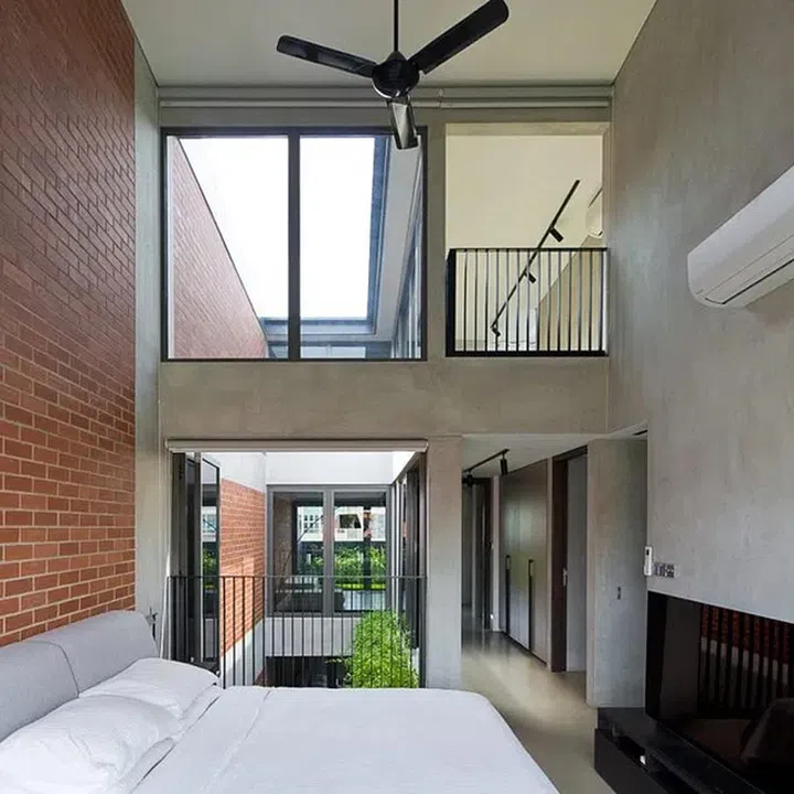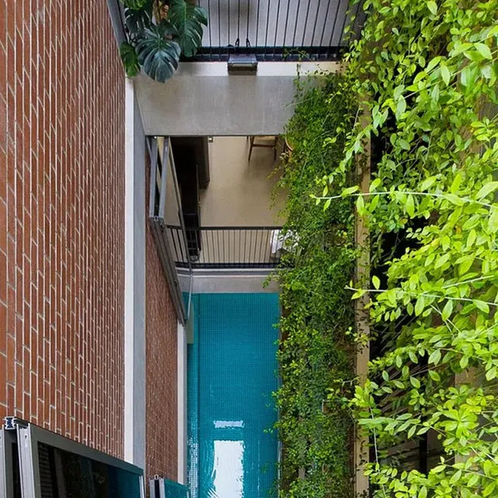 Although flanked by houses on both sides, the home is bright and well-ventilated, thanks to the four-storey air well that rises above the pool.