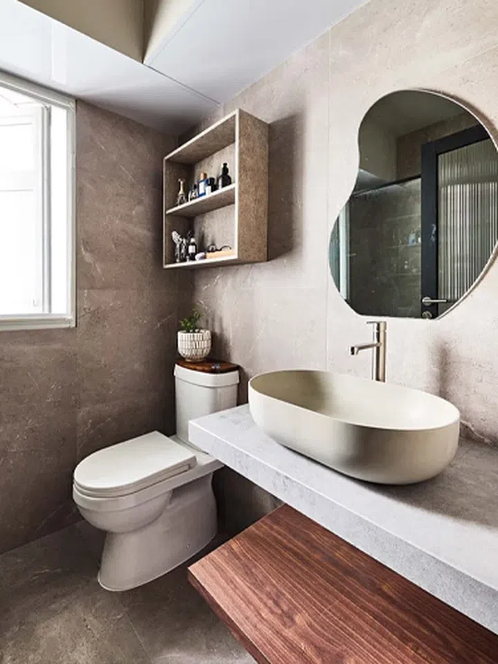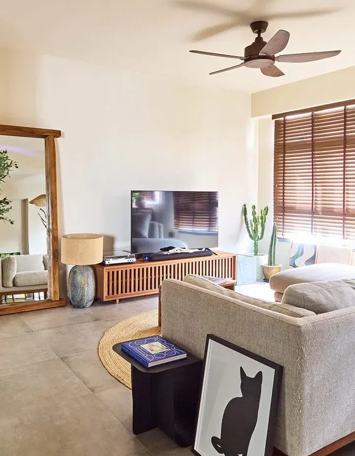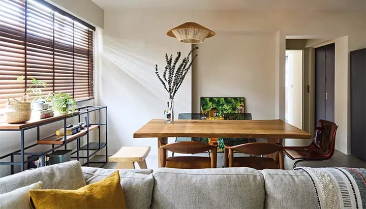 This BTO flat in Tampines is home to a young couple, who envisioned an earthy space with neutral, muted wall paint colours, cement screed finishes and wood elements.