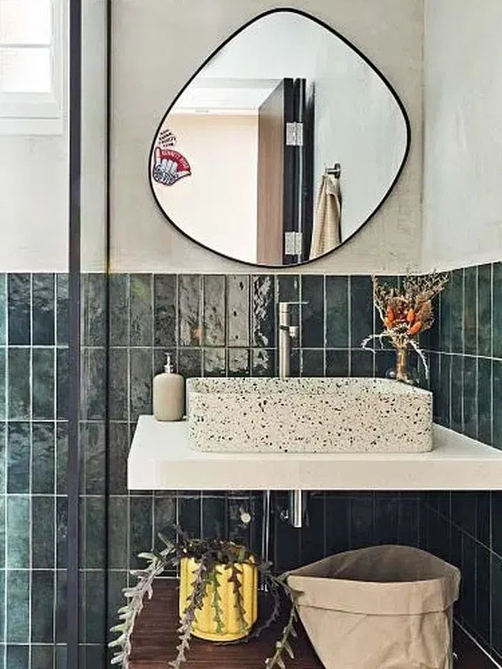 The common bathroom has its bottom half of the wall cladded with glossy dark green tiles and cement screed on top, a combination that Nigel feels differentiates it from the rest of the home and makes it stand out.