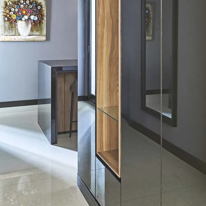 This sense of calm permeates the apartment, reinforced by the palette of dark and neutral hues that the design team chose in close consultation with the homeowners. It helped that the owners were willing to be adventurous when it came to colours and materials. As the apartment has an open concept, the resulting palette of black, grey and wood tones helped to balance things out by creating a cosier setting.
