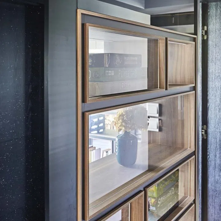 Strategic lighting and a carefully-curated collection of furniture help to accentuate the features of this apartment, too. The bookcase that separates the study and living areas, for instance, lights up to lend a cosy glow to the home. The design team worked closely with the homeowners during the furniture purchasing process, ensuring that the colours and profile of the individual pieces matched the overall aesthetic of the home.