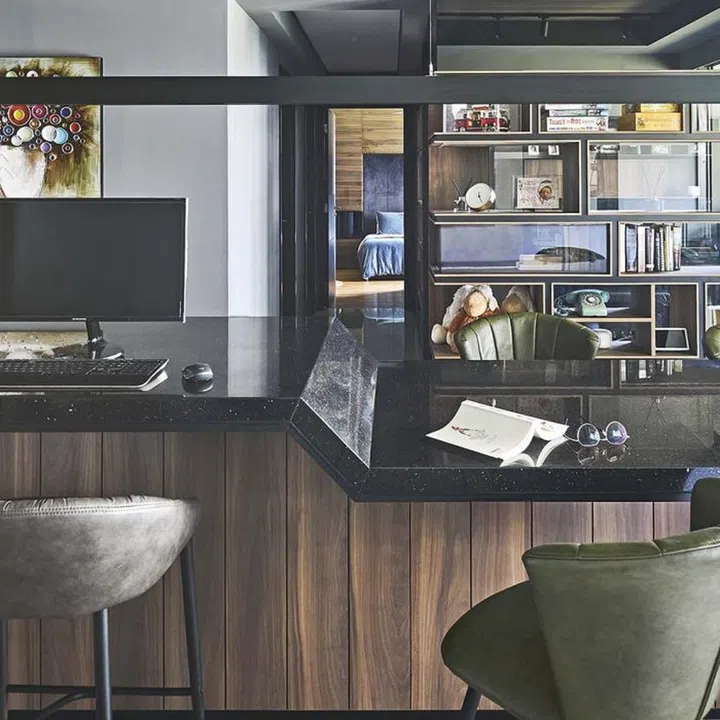 Instead, a long island counter takes centre stage in the communal area. This serves as a dining and working area for both the parents and children. Midway, it rises to form a bar counter, which the family can use as extra space for serving and preparing food.