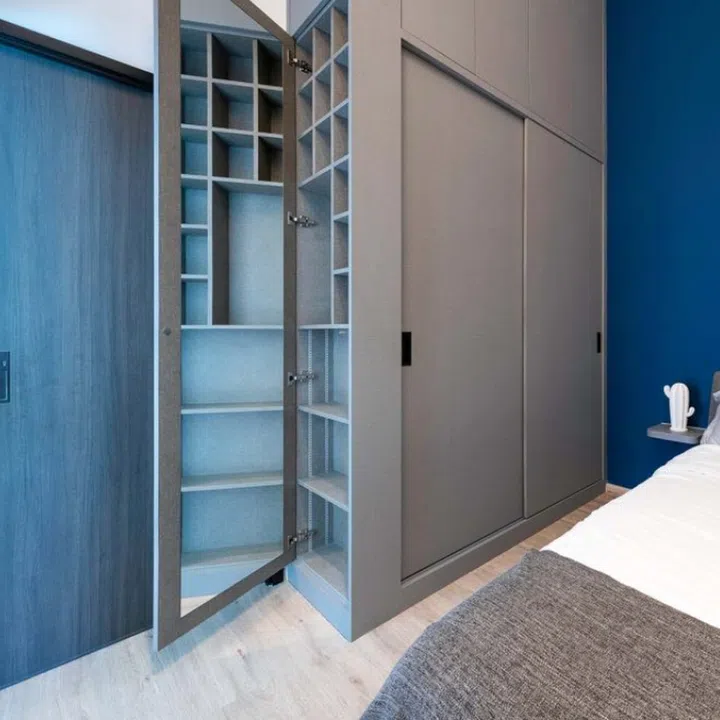 These include the flush-mounted tic tac door that opens and closes with a simple push and conceals the bedroom entrance.