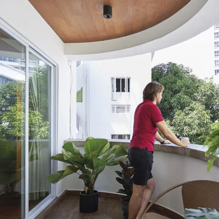 The master bedroom and the nursery shared a balcony whose floor and ceiling have been revamped with timber-look tiles. It is now a cosy spot that houses most of the couple’s plant collection.
