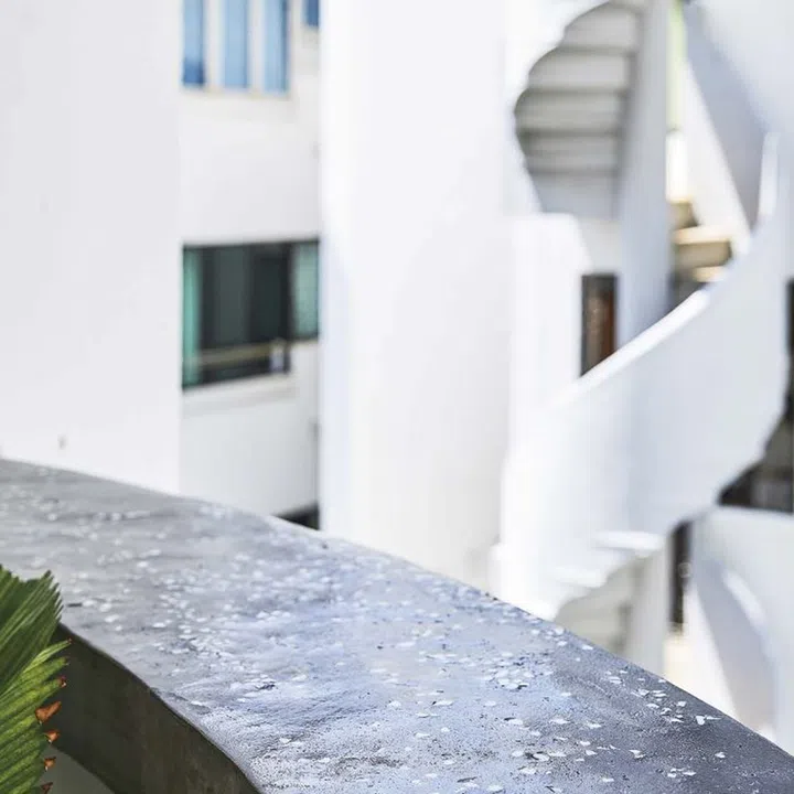 The balcony ledge required special finishes to highlight its curves, so Balazs contacted a local terrazzo specialist.