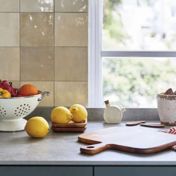 The glazed Spanish tiles in the kitchen from Hafary, for instance, were chosen because they look lovely against the sunset light and pair well with the couple’s vintage ocher sofa and the orange-red sculptural mobile from Japanese brand Tempo.