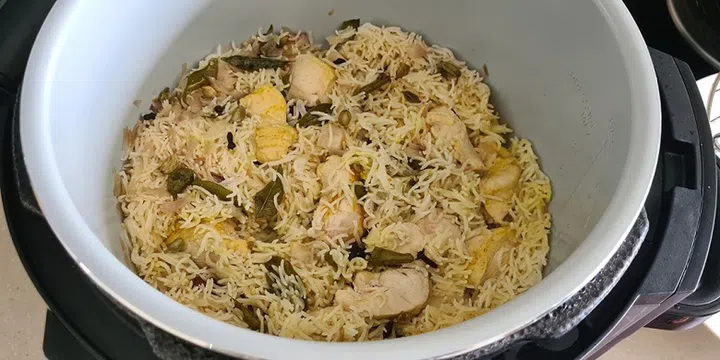 Then in went basmati rice, chicken broth, and spices. I followed the recipe for drumsticks to be placed on the reversible rack, as well as experimented with chicken breast pieces mixed with the rice. After a mere two minutes in the pressure cooker, the rice and chicken bites turned out really well — fluffy, moist, and perfectly cooked. The drumsticks, however, needed a bit more cooking.