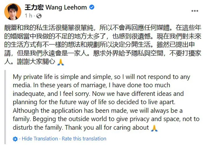 Singer Wang Leehom Announces Split From His Wife Lee Jinglei