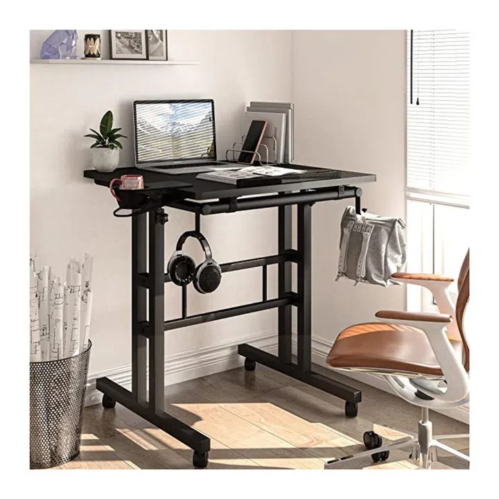 Looking for a standing desk but don't have a lot of space? Then this portable standing desk may be a great option. Beyond the usual adjustable height and table tilt features, it has 4 flexible wheels so you can move your desk wherever you want. Each wheel is equipped with a locking lever, so you can keep the desk firmly in place when needed. Plus, it comes with a cup holder and hook so your coffee mug and headphones are within easy reach.