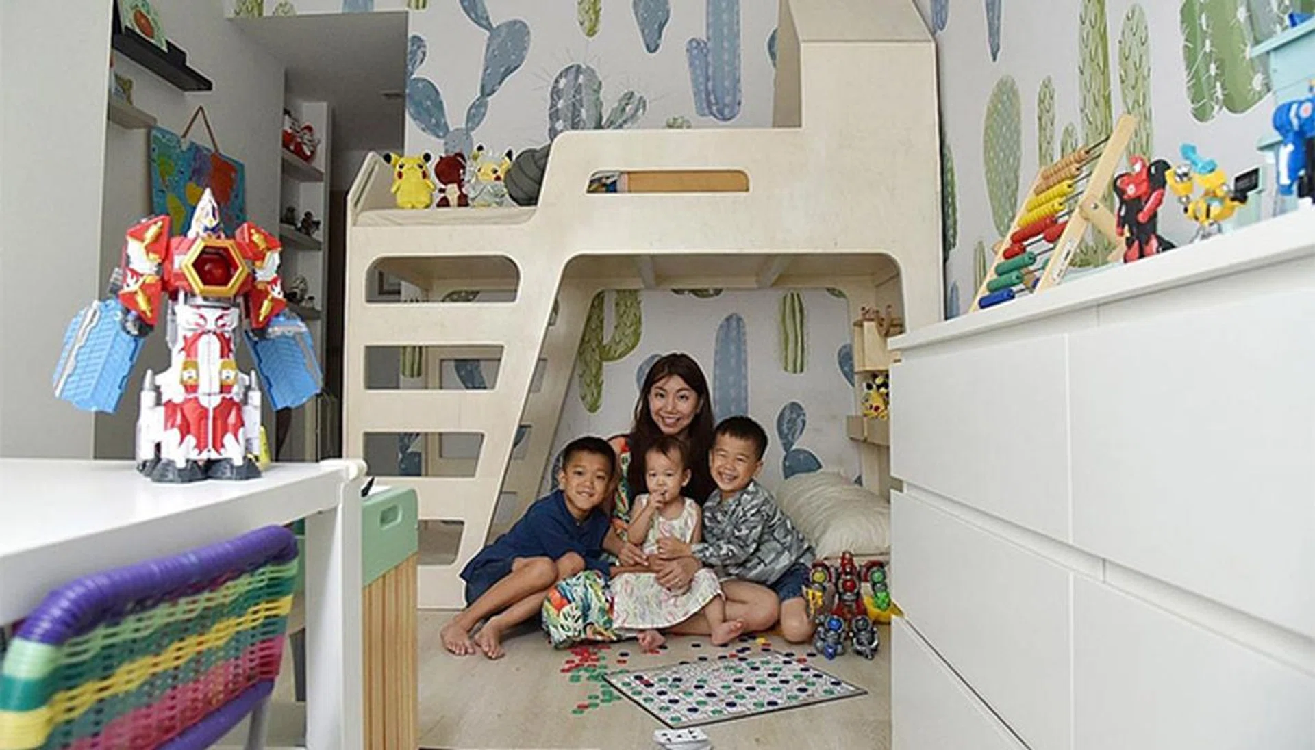 Realtor Natasha Goh with her three children in the boys' room, which features cacti prints on walls and furniture in neutral colours. (Photo: Jasmine Choong for The Straits Times)
