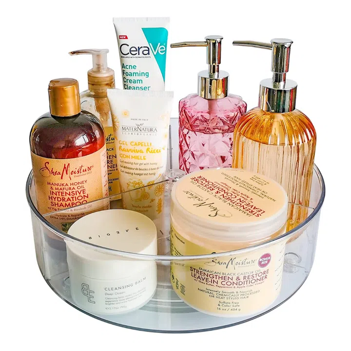 Besides using these lazy susan turntables to organise your beauty space, you can also use them to compartmentalise jars and sauces in the fridge, cabinets, kitchen counters and tabletops to make them more readily accessible.