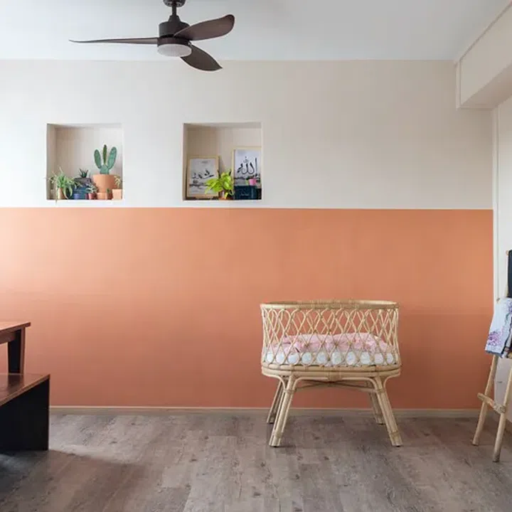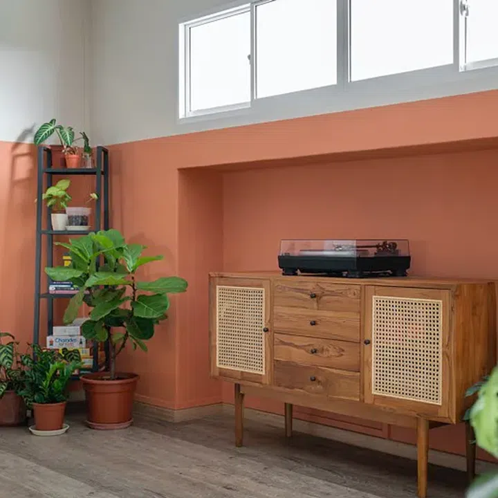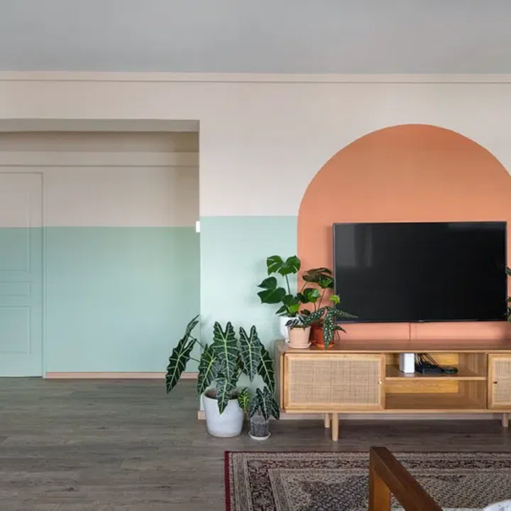 In the living room, Elly made use of the orange hue to create a minimalist television feature wall by painting an arch. This has the effect of creating a layer without adding unnecessary bulk to the space.