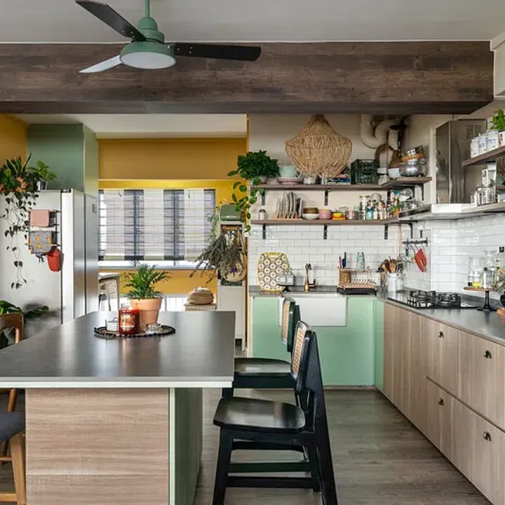 For Nizam and Ezza, home is a bright and welcoming executive apartment in Choa Chu Kang, painted in several vibrant shades. The 155sqm apartment houses their four children as well, so having a large communal space for the family was one of their top priorities in the design.
