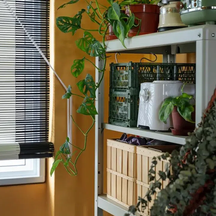 Part of the bohemian theme is to embrace a lived-in look. The kitchen embodies this with its open shelving, which displays the family’s crockery alongside plenty of plants and accessories that make for a welcoming home.