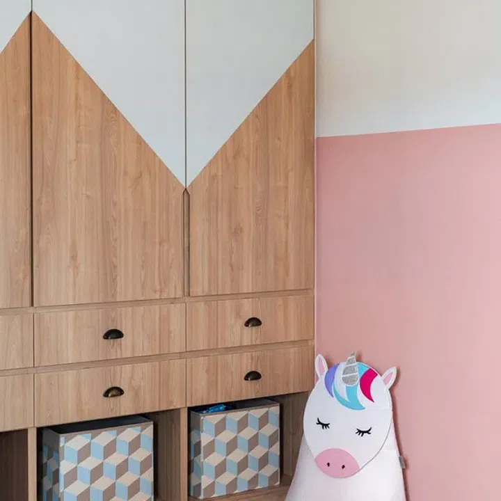 In the bedrooms, the colour-blocking continues on the wardrobes – this time layering colours with wood tones, and with different shapes for visual interest.