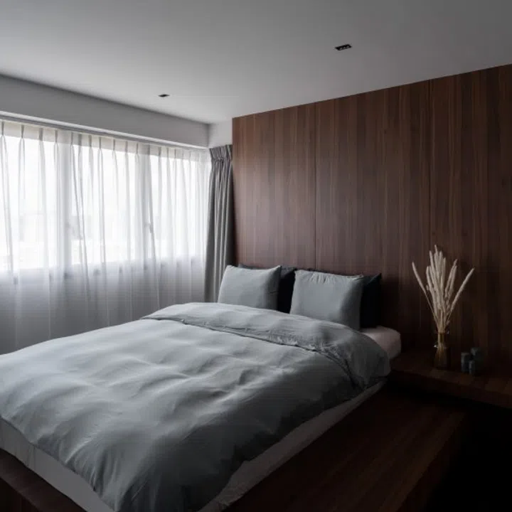 To open up the space, Arche Interior combined the master bedroom and common bedroom to create a palatial master suite. Here, a feature wall with a pronounced wood grain doubles up as a headboard.