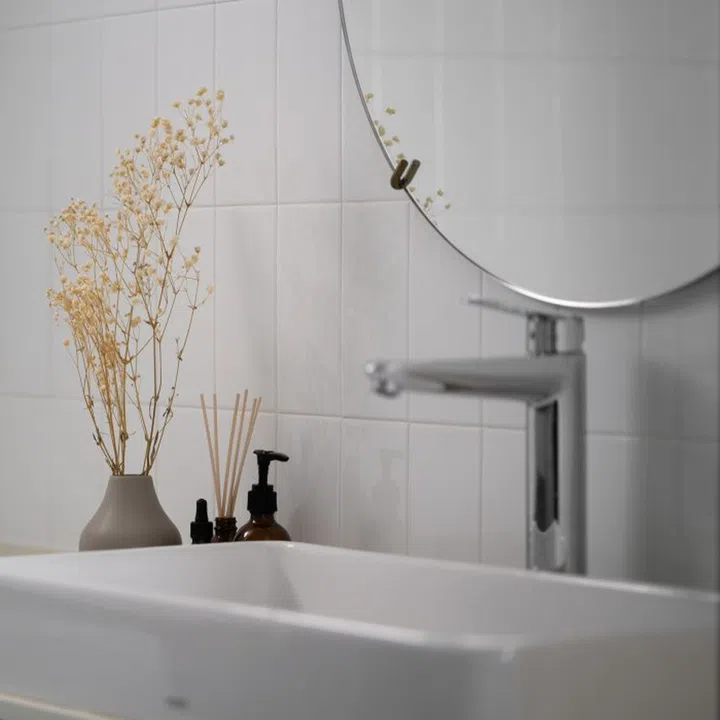 In the bathrooms, the same two-tone palette that appears in the living room is echoed in the form of a white mosaic wall paired with grey tiles.