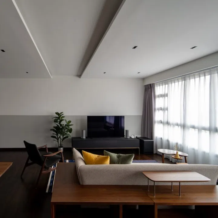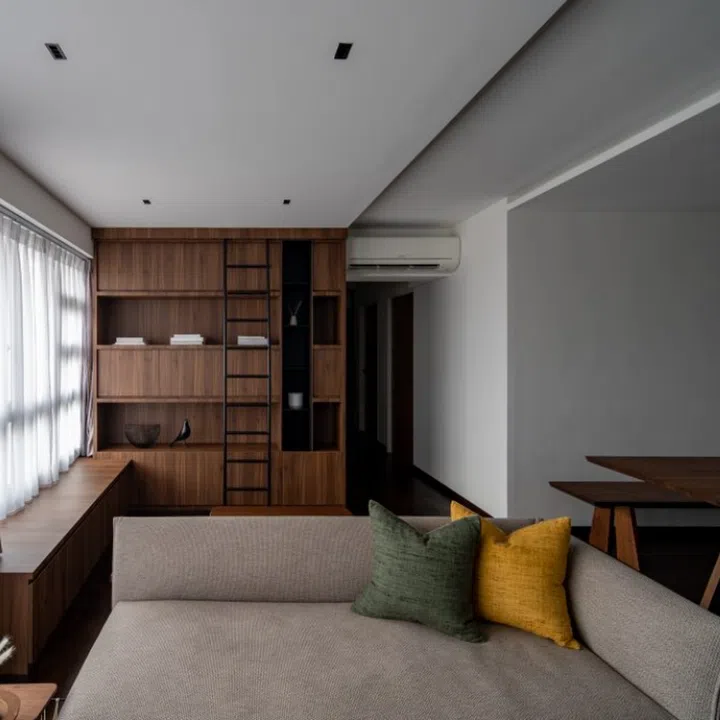To keep the space visually interesting without adding unnecessary clutter, Arche Interior used pale grey to create a half-wall in the living room. The rest of the palette was kept in woody, earthy tones. Pops of colour were added in the form of accessories like cushions, which can be easily swapped out.
