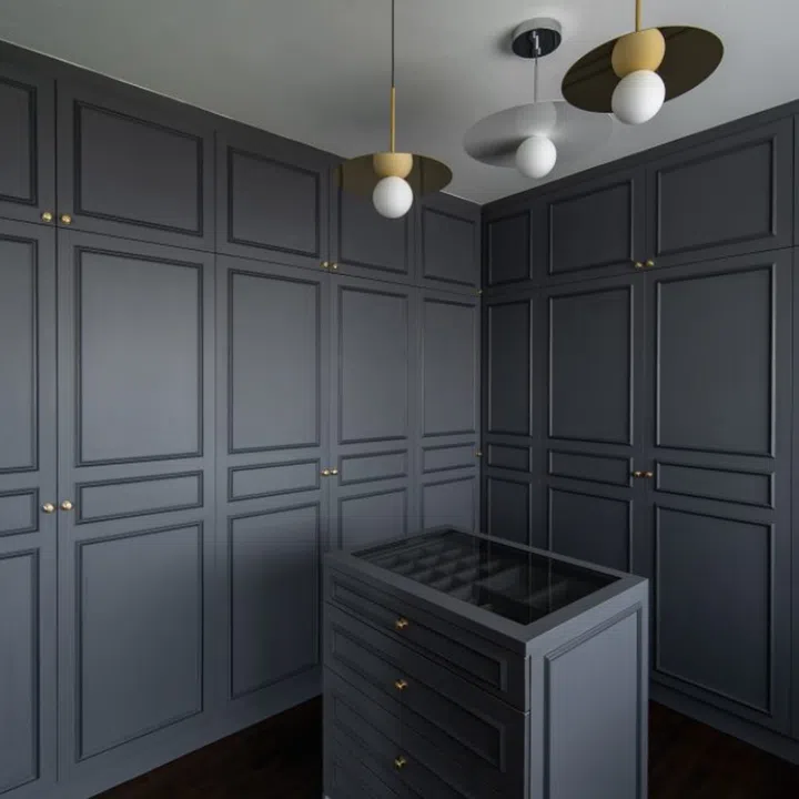 The walk-in wardrobe features classic wainscoting, paired with brass door knobs from Lava Vella that stand out against the grey. Above, a family of Bola Disc pendant lights makes a stylish statement.