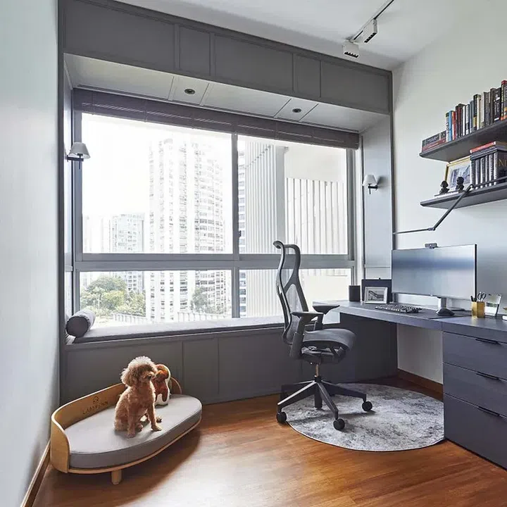 One of the bedrooms has been converted into a study that allows the couple to work from home more comfortably. However, the provisions in this room, as well as in the rest of the home, cater not just to the couple, but to their fur kid too. The bay window in the study has been designed with upholstery so that they can lounge when taking a break and their toy poodle can rest while its owners are working.