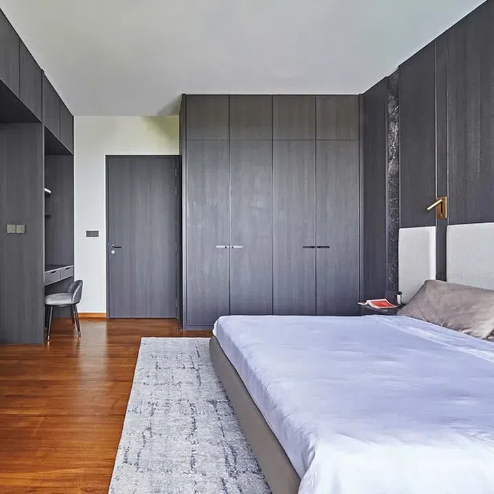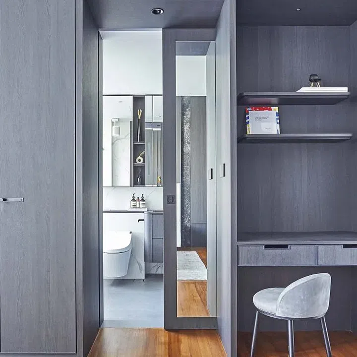 The floor-to-ceiling wardrobe-cum-dresser unit is also finished in a dark wood laminate.