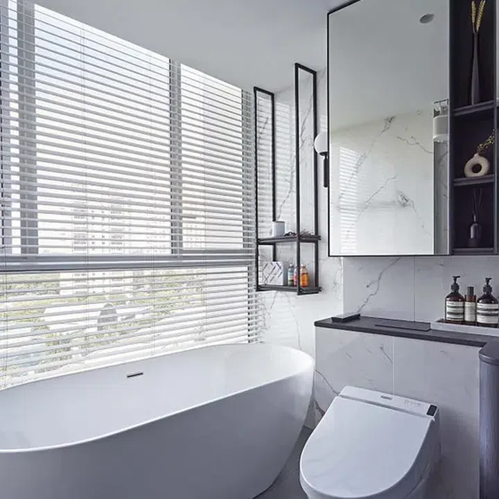 A freestanding bathtub replaces an existing sunken bath in the master bathroom. Together with the suspended cabinet below the wash basin, wall-mounted storage shelves with mirrored doors above, and the refreshing monochromatic colour scheme, the master bathroom exudes a bright and breezy feel.