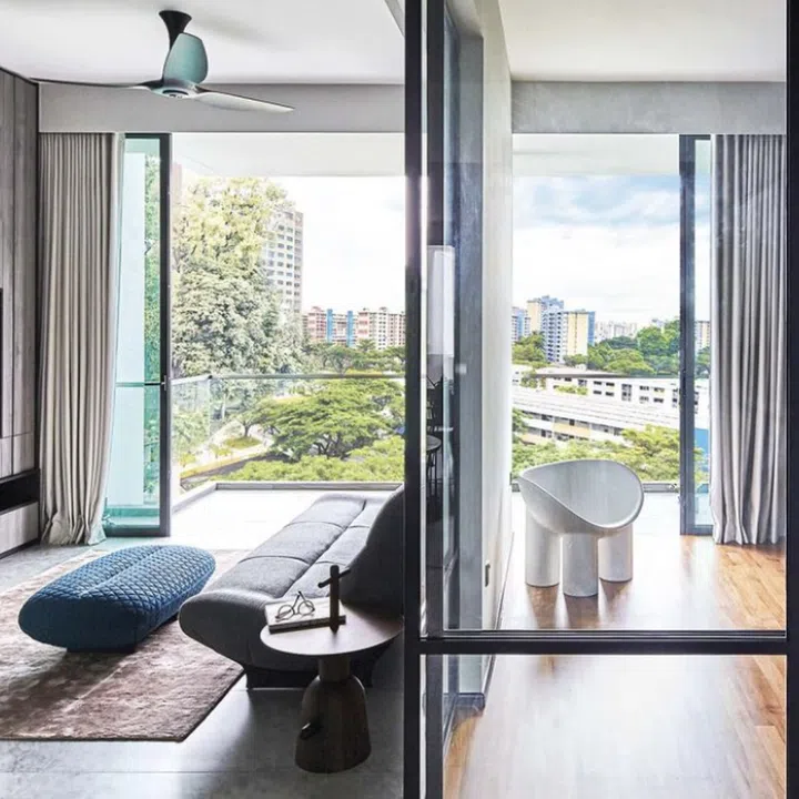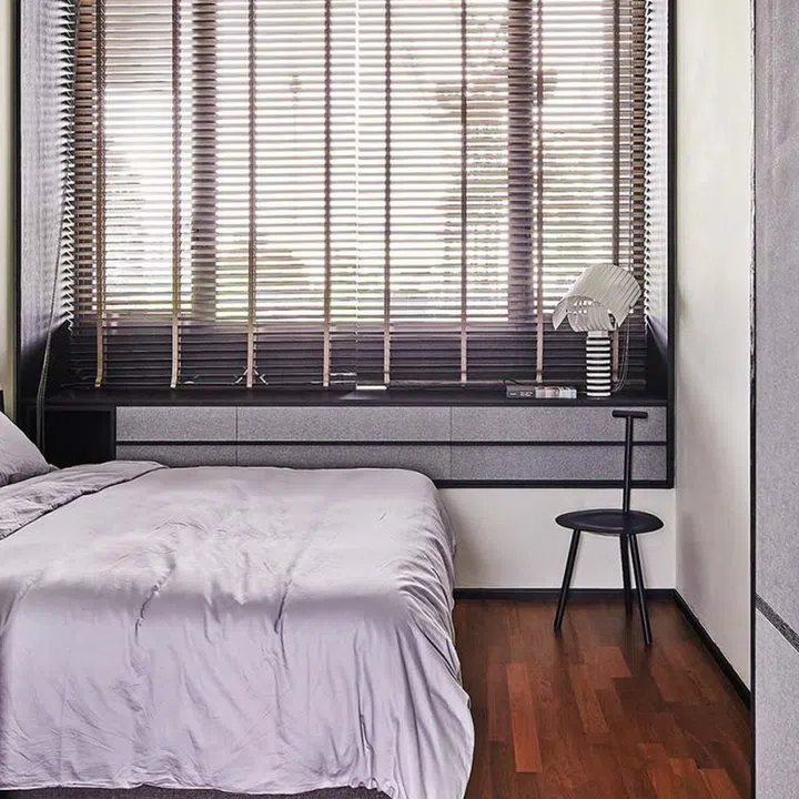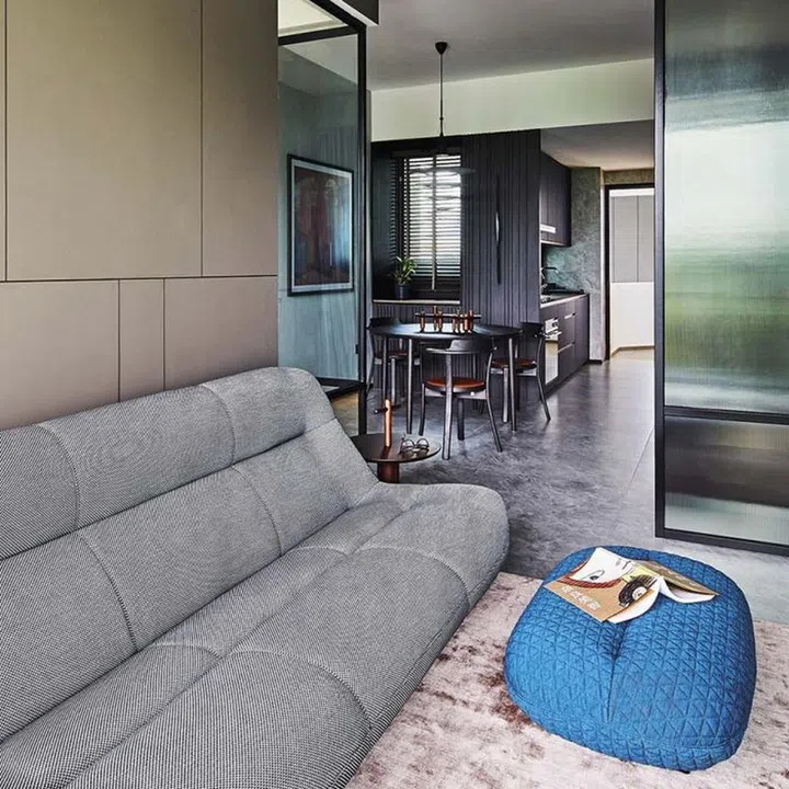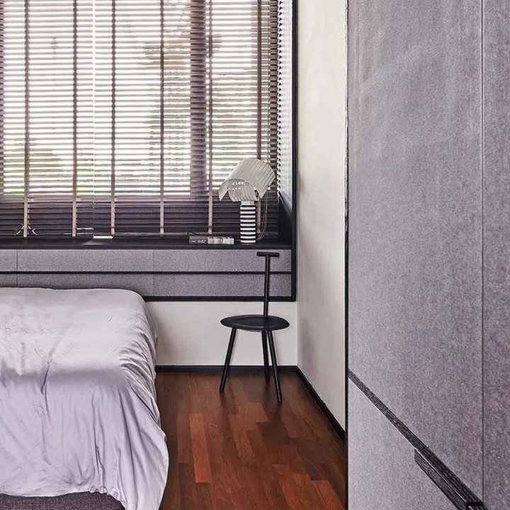 One of the bedrooms lies directly behind the sofa. Joey hacked part of the existing L-shaped bedroom wall to make way for fixed and sliding glass panels. Originally intended as a nursery for when the couple starts a family, Joey tweaked the design to accommodate their working from home requirements for now.