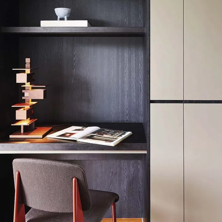 One of the bedrooms in the couple’s previous three-bedroom home was converted into a walk-in wardrobe. Without the third one in their new home, two rows of full-height, built-in his and hers wardrobes and an additional full-height cabinet leading to the master bathroom help to meet their storage needs.