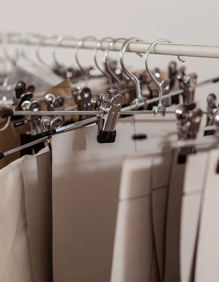 Instead of using plastic, keep the dust off your clothes by investing in garment bags made of a light, breathable material like muslin.