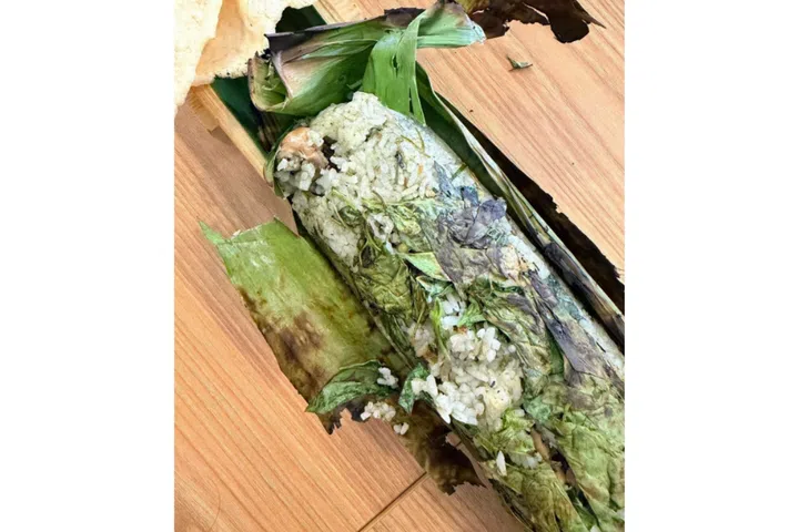 Grilled rice with baby squid at Noe Noesantara (@noe.santara.id on Instagram), wrapped in banana leaves and cooked in a bamboo tube, does not look like much – but my family agrees it is the most memorable item on the table. The rice is laced with kemangi, or lemon basil leaves, which add a touch of zest, and studded with chilli and bits of chewy squid. We hoover this up despite saying we would try not to eat too much carbs.