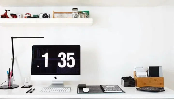 The study desk displays a curated selection of knick-knacks precious to the homeowner.
