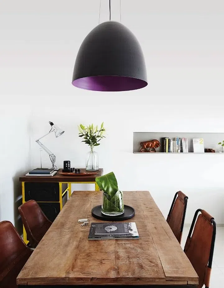 The oversized pendant lamps were chosen to make the ceiling feel loftier. The yellow armchair is a vintage design from the 1940s that was passed down from her grand uncle.