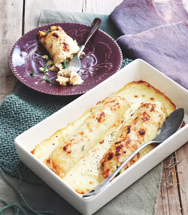 These homemade spinach and cheese potato crepes make a lovely vegetarian entrée together with a side salad.