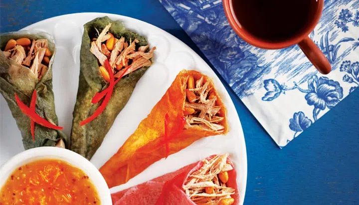 A platter of tinted flour wrappers are delicious and easy to eat for your little ones.